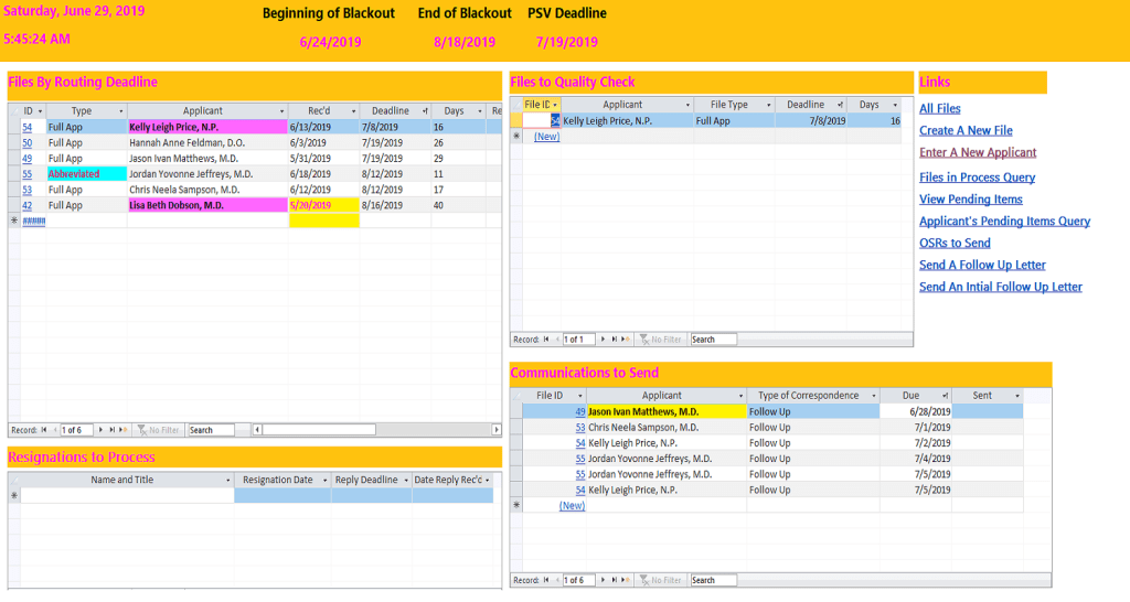 Solution: The sample Credentialing Coordinator database efficiently documents and tracks the life cycle of applications to the medical staff. It significantly improves the accuracy and efficiency of a coordinator. Required and additional documentation and verifications for each file are not left up to memory or even reviewing notes. Depending on the type of employment and practitioner, the usual pending documents and verifications can be auto-added to a file/record to track. Only verifications and pending items specific to a file have to be manually entered from a drop-down list. Issues and privilege criteria can also be tracked in the database. The drop-down lists in the application are populated with information from the applicable organization such as NAMSS and the ABMS. Even required followups can be scheduled in the tool, and there is ample space for organized, typed, notes. I also automated the follow-up communication which pulls the current pending items (eliminating the need to do extensive file review prior to follow-up) and deadlines. The Quality Check helps the coordinator be more confident and the accountable professional for 100% review of their files. This eliminates the need to dedicate the supervisory resource to one team and would allow that individual to only QA the riskiest files or those that meet some other criterion. Additionally, the QA supervisor would be capable of ensuring the compliance of files for all teams within the department. Lastly, the intelligent dashboard keeps the coordinator on task and in front of deadlines at all times.