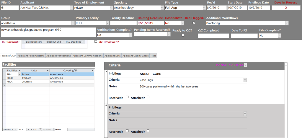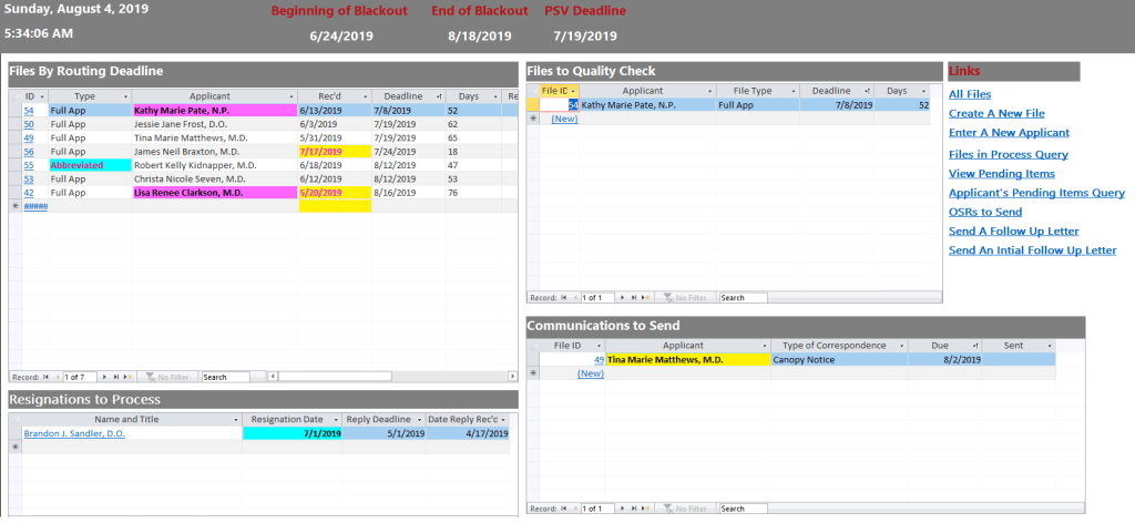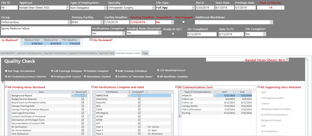 Solution: The sample Credentialing Coordinator database efficiently documents and tracks the life cycle of applications to the medical staff. It significantly improves the accuracy and efficiency of a coordinator. Required and additional documentation and verifications for each file are not left up to memory or even reviewing notes. Depending on the type of employment and practitioner, the usual pending documents and verifications can be auto-added to a file/record to track. Only verifications and pending items specific to a file have to be manually entered from a drop-down list. Issues and privilege criteria can also be tracked in the database. The drop-down lists in the application are populated with information from the applicable organization such as NAMSS and the ABMS. Even required followups can be scheduled in the tool, and there is ample space for organized, typed, notes. I also automated the follow-up communication which pulls the current pending items (eliminating the need to do extensive file review prior to follow-up) and deadlines. The Quality Check helps the coordinator be more confident and the accountable professional for 100% review of their files. This eliminates the need to dedicate the supervisory resource to one team and would allow that individual to only QA the riskiest files or those that meet some other criterion. Additionally, the QA supervisor would be capable of ensuring the compliance of files for all teams within the department. Lastly, the intelligent dashboard keeps the coordinator on task and in front of deadlines at all times.
